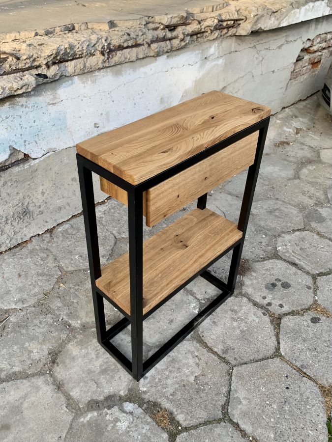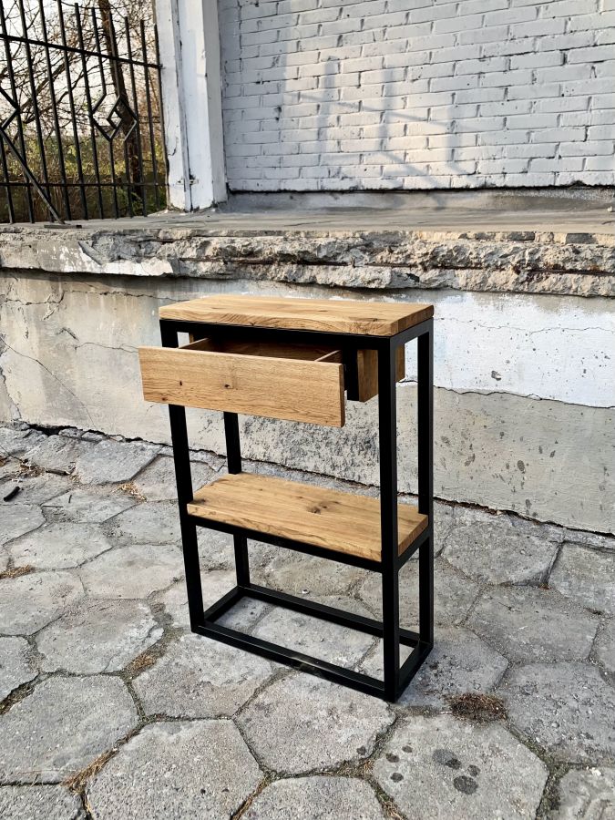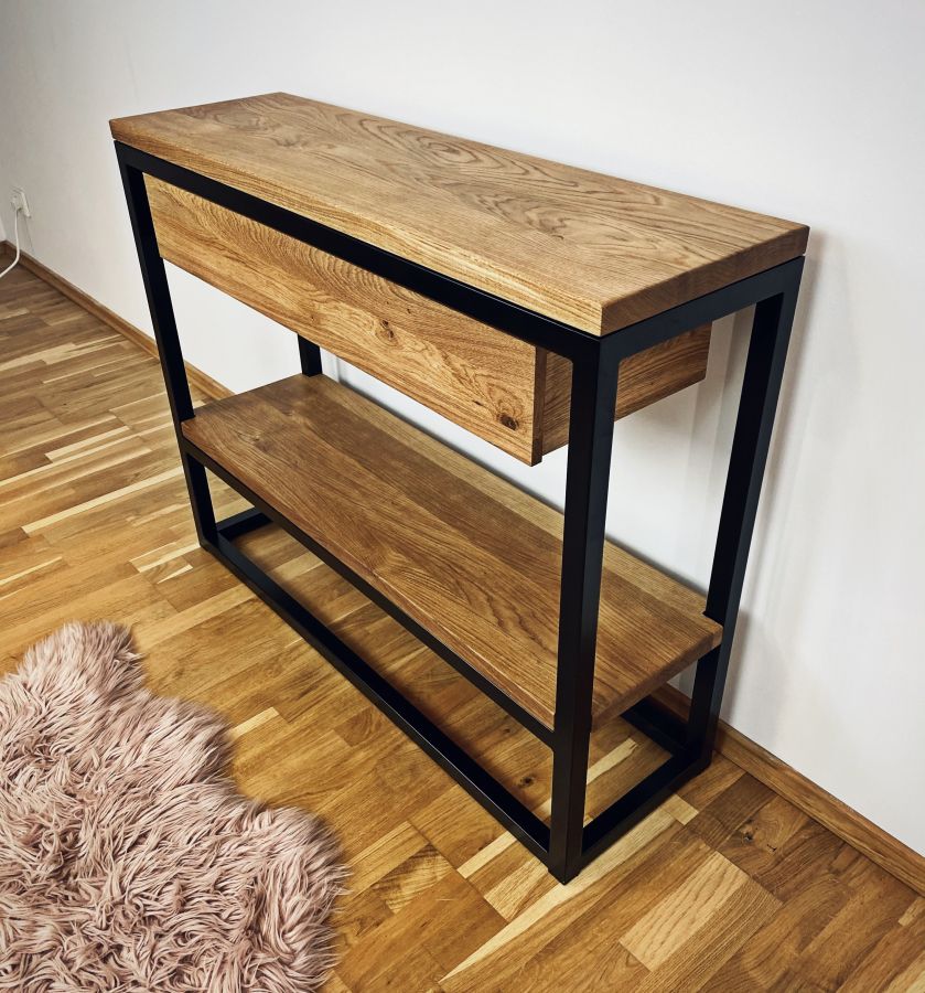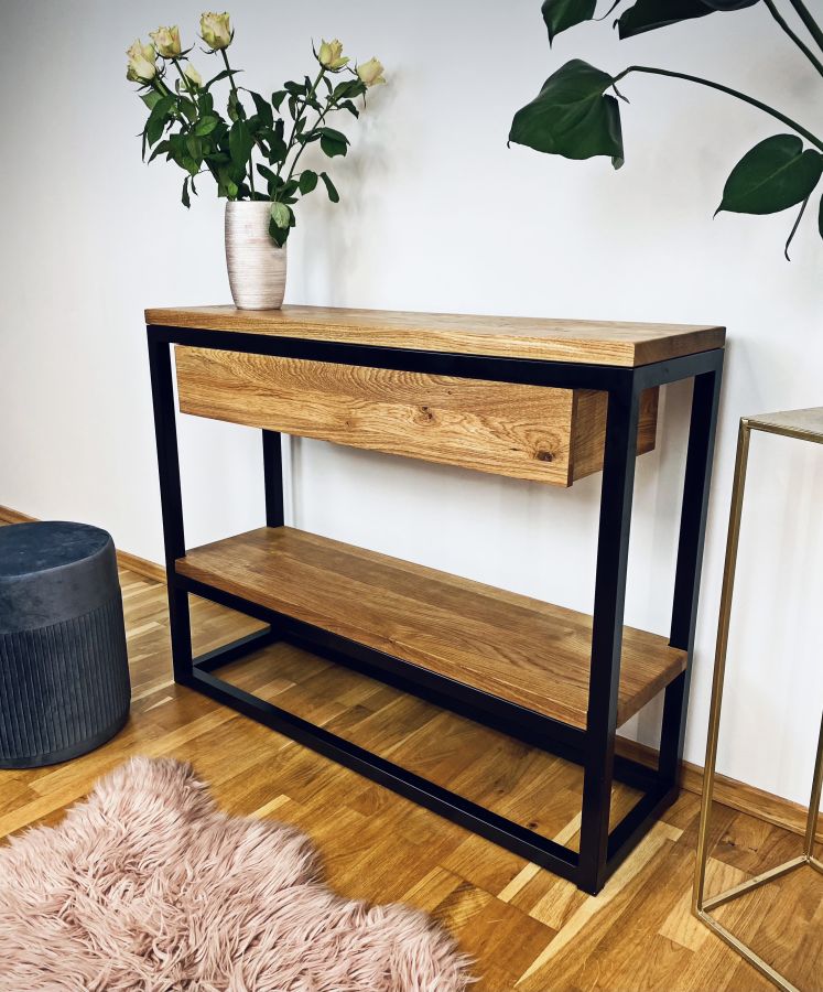 Przedstawiamy Państwu konsolę wykonaną z litego drewna dębowego w stylu rustykalnym. Solidny stalowy stelaż, który jednocześnie wyglada lekko i nowocześnie, zagwarantuje niebywałą trwałość. Konsola będzie mogła cieszyć Nasze oczy przez długie lata, nie tracąc przy tym nic ze swojej niepowtarzalnej, prostej i pięknej formy. Szuflada idealnie sprawdzi się do przechowywania drobnych rzeczy.