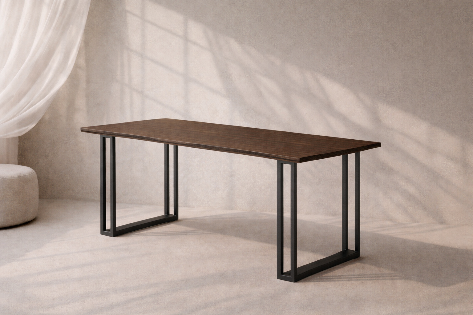 To, co wyróżnia stół ASSI, to niezwykle charakterystyczna stalowa podstawa w kształcie dynamicznej litery U, która łączy w sobie minimalizm, mocną formę i wizualną lekkość. Malowana proszkowo stal w kolorze czarnym lub grafitowym tworzy wyrazisty kontrast z ciepłem dębowego blatu i wprowadza do przestrzeni nowoczesny, loftowy charakter. Dzięki szerokiemu rozstawowi podstawy, stół ASSI zapewnia dużą wygodę użytkowania – bez przeszkód zmieścisz przy nim krzesła po każdej stronie.