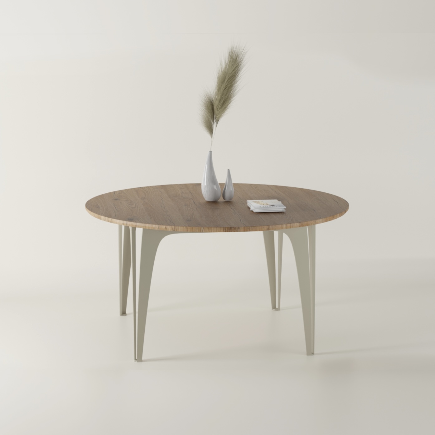 Stół dębowy FERSY okrągły to połączenie naturalnego piękna litego drewna z nowoczesną, lekką formą. Wyróżniają go laserowo cięte nogi z blachy stalowej w kolorze kaszmiru, które nadają mu unikalny, elegancki wygląd. To nowoczesna propozycja dla osób ceniących oryginalny design i trwałość.