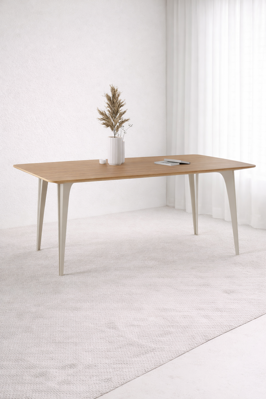 Wyjątkowe nogi z blachy stalowej, ciętej laserowo, to kluczowy element designu tego modelu. Malowane proszkowo na elegancki kolor kaszmiru, dodają stołowi subtelnej, luksusowej estetyki. Dzięki zaawansowanej technologii cięcia, nogi mają precyzyjne, geometryczne formy, które nadają całości nowoczesny i lekki charakter.