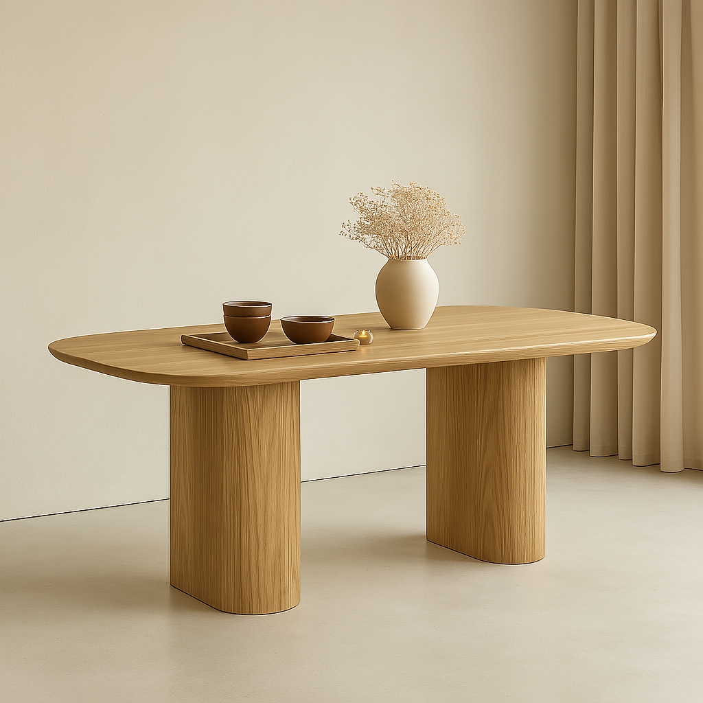 Stół dębowy LAFIA to kwintesencja nowoczesnego wzornictwa inspirowanego harmonią natury i filozofią stylu Japandi. Zaokrąglony blat, obłe krawędzie i masywne owalne nogi tworzą spójną, rzeźbiarską całość, która łączy w sobie funkcjonalność, elegancję i przytulność. Wykonany w całości z litego drewna dębowego, stół LAFIA przyciąga uwagę subtelną formą i naturalnym wykończeniem, idealnie pasującym do wnętrz w stylu nowoczesnym, organicznym, skandynawskim i japandi.