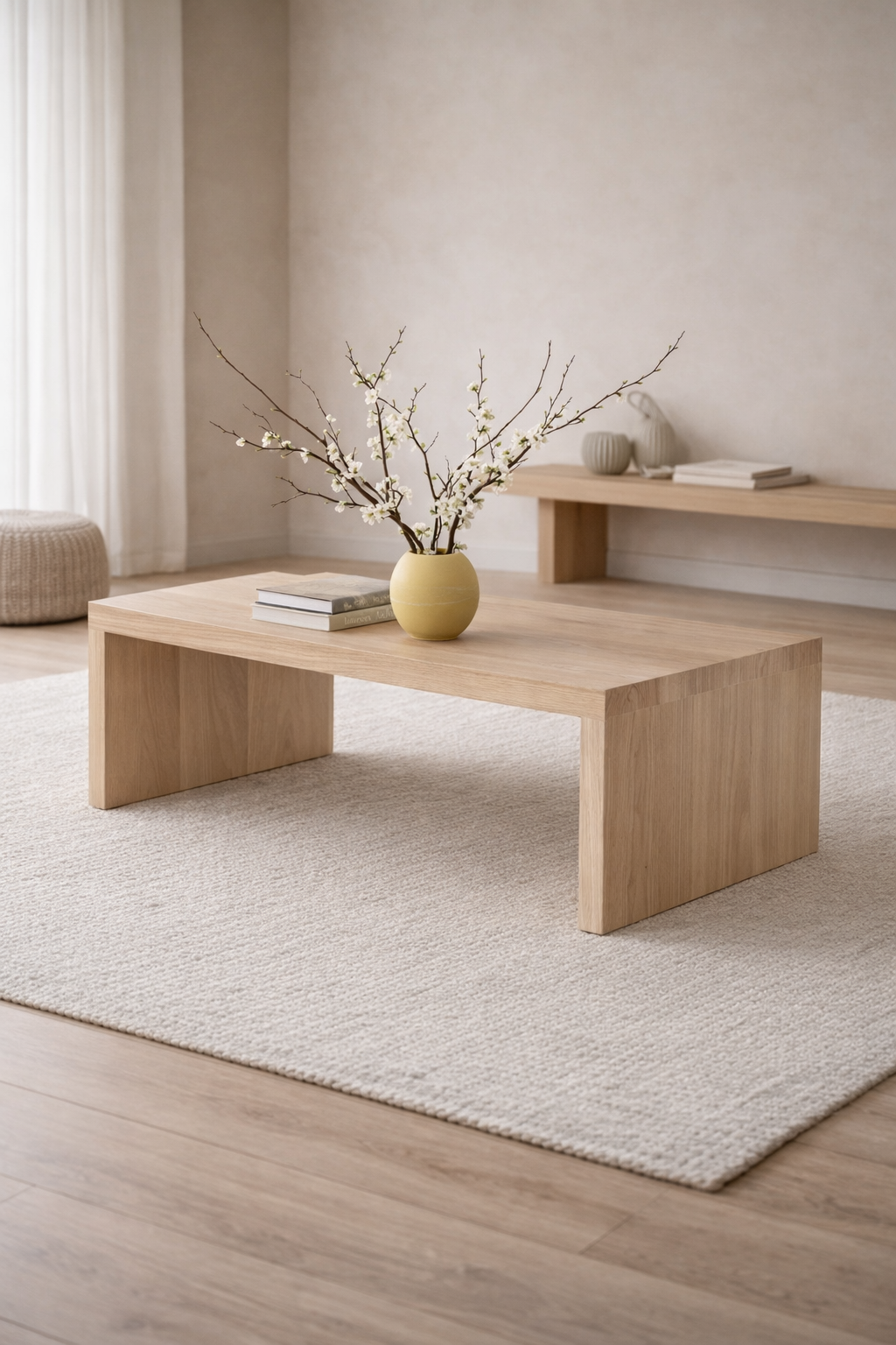 Niska forma stolika kawowego SEYA podkreśla jego nowoczesny charakter i sprawia, że idealnie komponuje się z sofami o prostej, współczesnej linii. Jasny kolor dębu oraz geometryczna forma doskonale wpisują się w styl japandi, gdzie liczy się równowaga i naturalność, a także w styl scandi i minimalistyczne wnętrza. To nowoczesny stolik kawowy z drewna, który wprowadza do salonu spokój i wizualną lekkość.