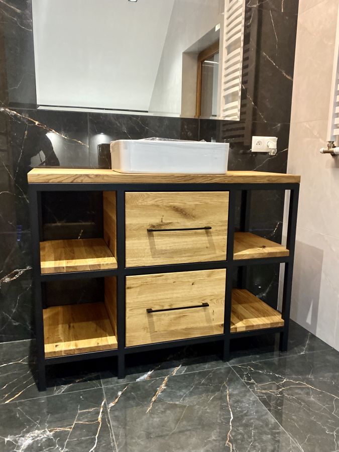 Przedstawiamy Państwu szafkę łazienkową wykonaną z litego drewna dębowego w stylu rustykalnym. Stalowy stelaż, który jednocześnie wyglada lekko i nowocześnie, zagwarantuje niebywałą trwałość. Szafka będzie mogła cieszyć Nasze oczy przez długie lata, nie tracąc przy tym nic ze swojej niepowtarzalnej, prostej i pięknej formy. Pojemne dwie szuflady oraz cztery półki po bokach