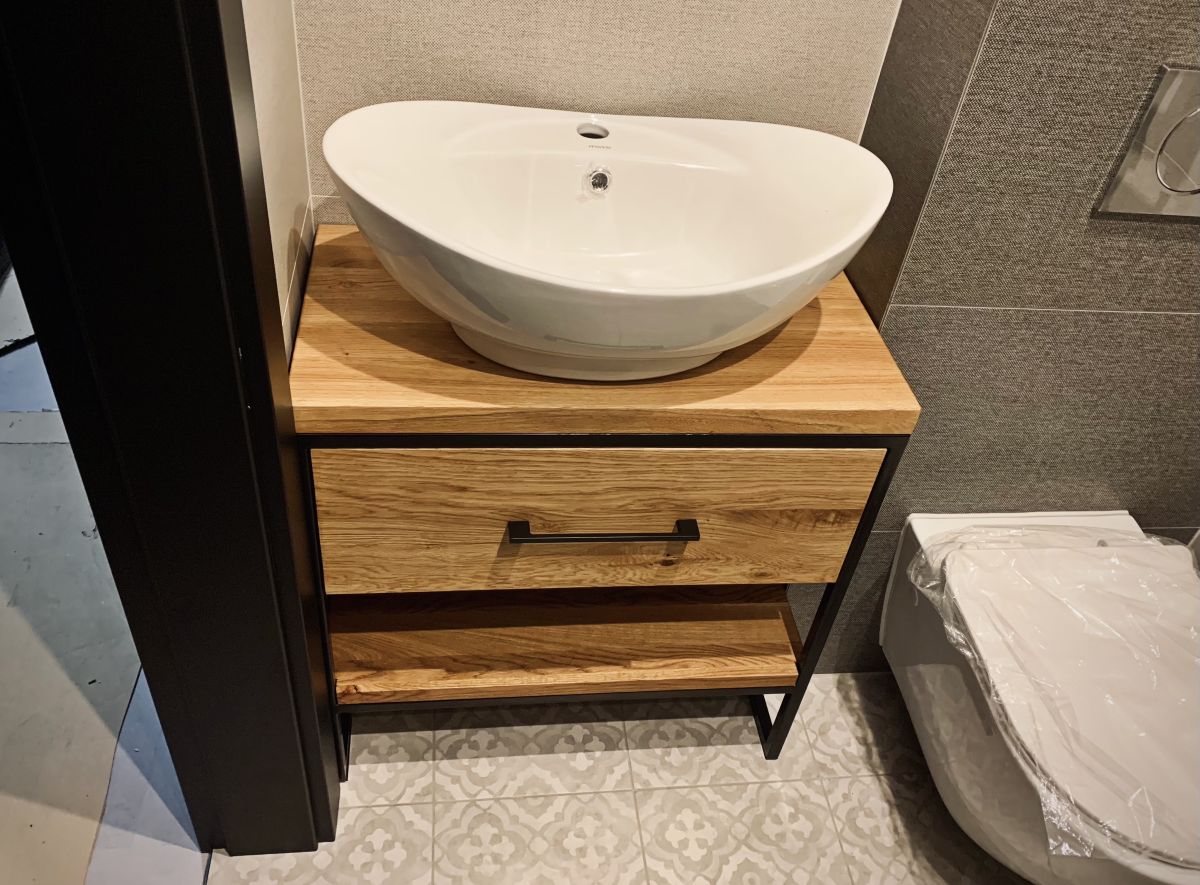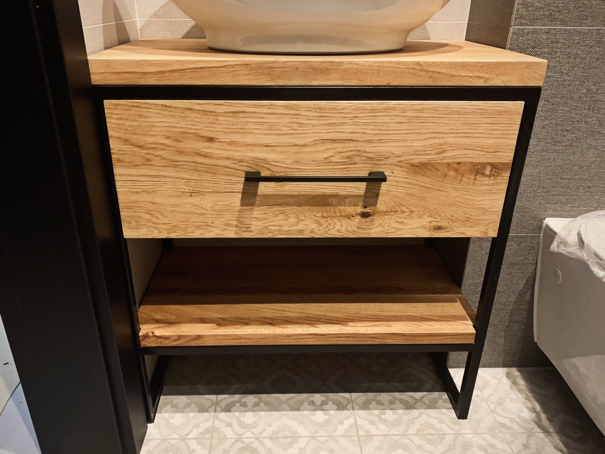 Przedstawiamy Państwu szafkę łazienkową wykonaną z litego drewna dębowego w stylu rustykalnym. Blat górny został wykończony naturalnym oflisem. Stalowy stelaż, który jednocześnie wyglada lekko i nowocześnie, zagwarantuje niebywałą trwałość. Szafka będzie mogła cieszyć Nasze oczy przez długie lata, nie tracąc przy tym nic ze swojej niepowtarzalnej, prostej i pięknej formy. Pojemna szuflada oraz półka.
