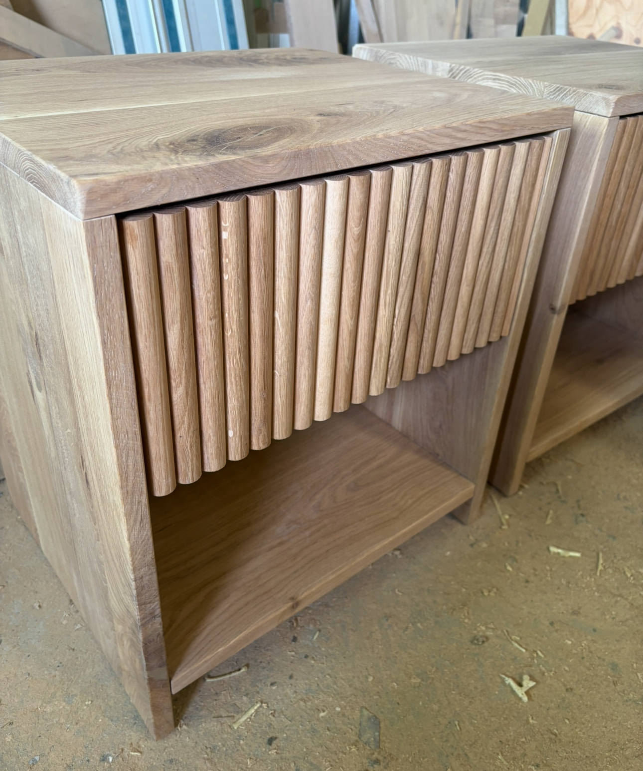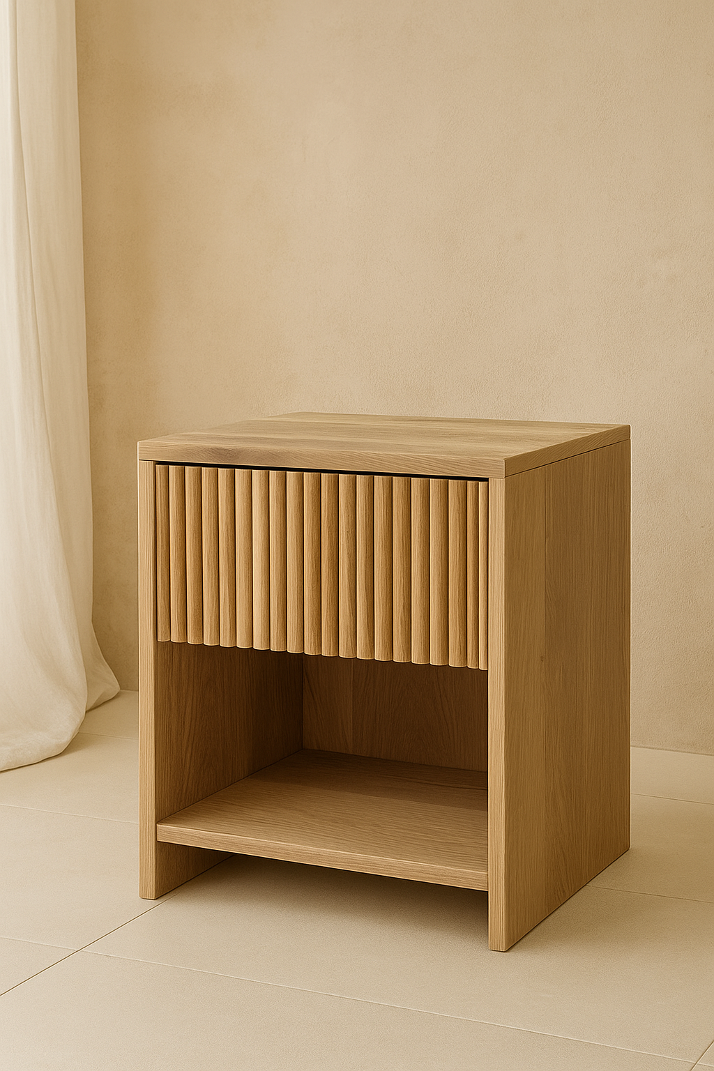 Szafka nocna dębowa ryflowana FISYA z ryflowanym frontem to idealne rozwiązanie dla osób ceniących wysoką jakość, naturalne materiały i nowoczesny design. Wykonana z litego drewna dębowego, zachwyca swoją trwałością, unikalnym usłojeniem oraz ponadczasową estetyką. Doskonale sprawdzi się zarówno w klasycznych, jak i nowoczesnych wnętrzach, dodając sypialni ciepła i elegancji.
