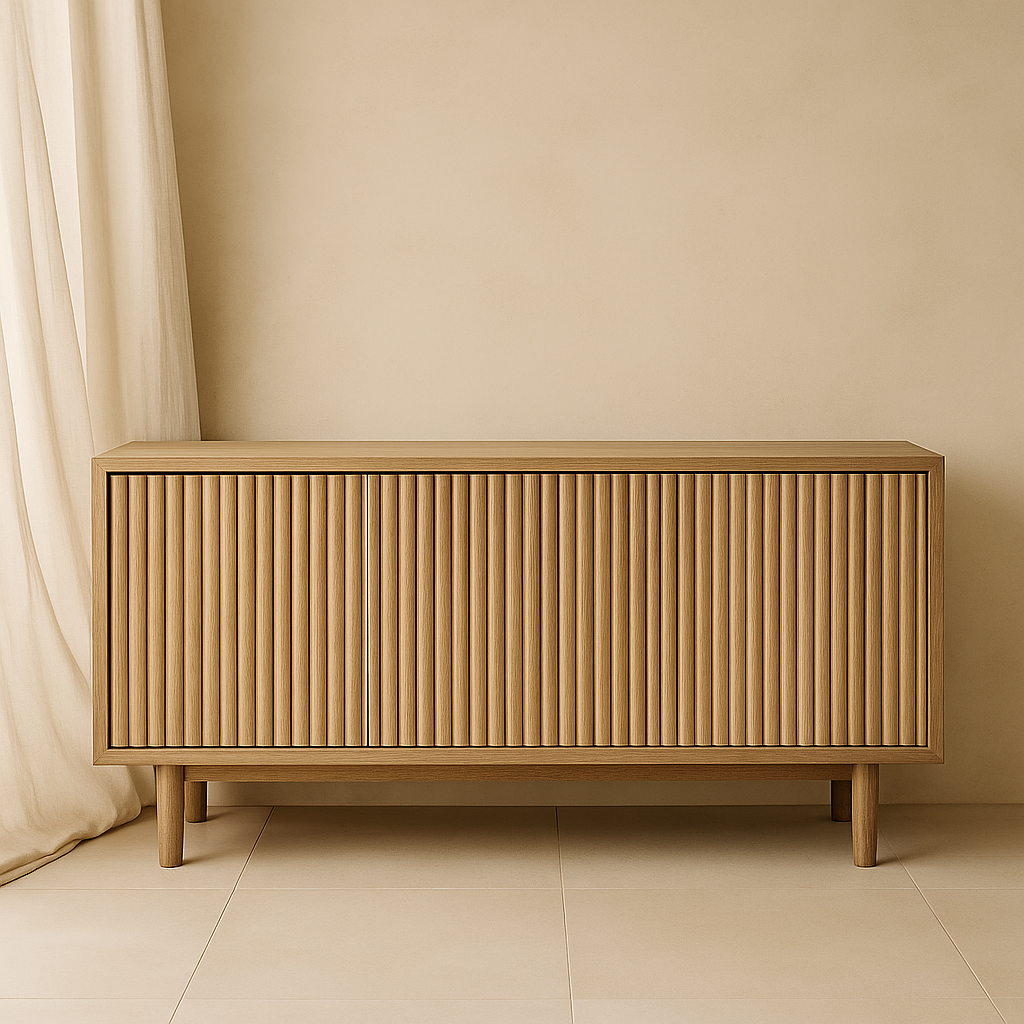 Najbardziej rozpoznawalnym elementem wizualnym szafki FISYA są jej ryflowane fronty, wykonane z perfekcyjnie frezowanego drewna. Pionowy rytm listew nadaje meblowi wyjątkową głębię optyczną i podkreśla jego naturalny charakter. Ryflowanie wprowadza do wnętrza ciekawą grę światła i cienia, co szczególnie pięknie prezentuje się w słonecznych pomieszczeniach lub przy oświetleniu bocznym. Ten detal sprawia, że szafka FISYA świetnie wpisuje się nie tylko w styl japandi, ale również w estetykę modern organic, skandynawską.