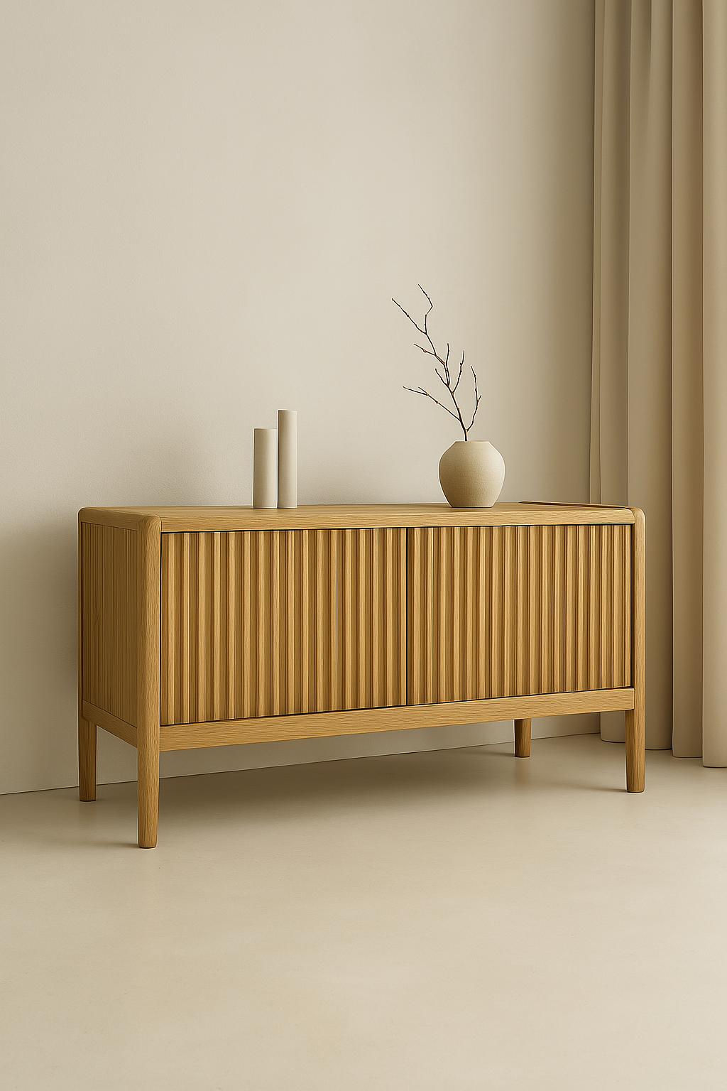 Szafka RTV TAI to esencja harmonii między tradycyjnym rzemiosłem a współczesnym wzornictwem. Wykonana z litego drewna dębowego, zachwyca elegancją, solidnością i detalem, który od razu przyciąga wzrok – ryflowanymi frontami o pionowym układzie. Jej zaokrąglone krawędzie i naturalne wybarwienie czynią z niej wyjątkowo uniwersalny mebel, który odnajdzie się w przestrzeniach nowoczesnych, japandi, skandynawskich, loftowych czy minimalistycznych.