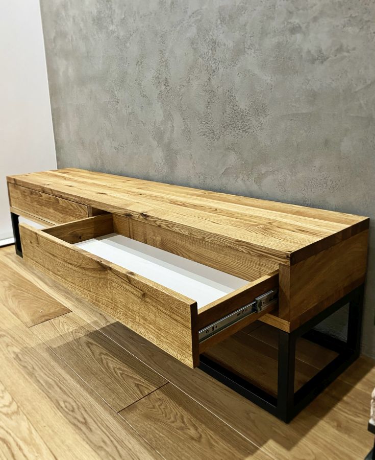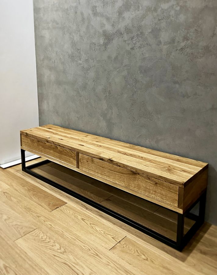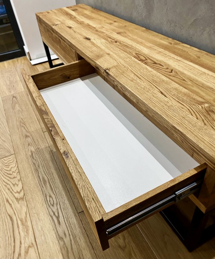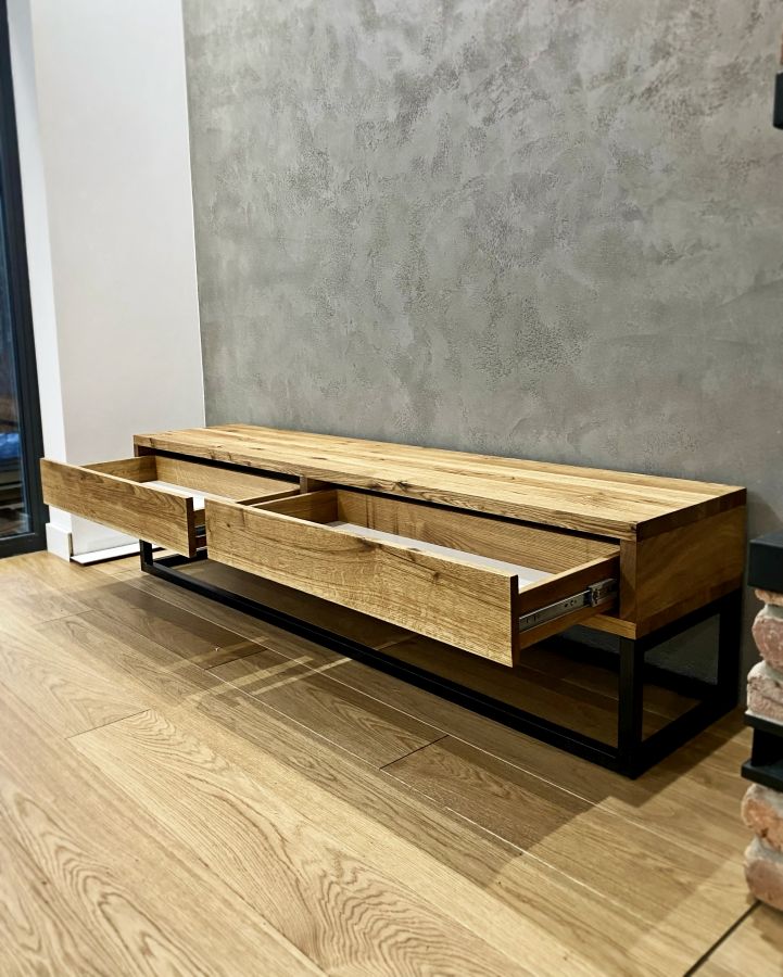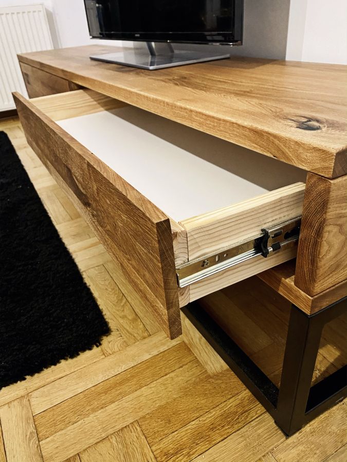 Przedstawiamy Państwu szafkę RTV wykonaną z litego drewna dębowego w stylu rustykalnym. Stalowy stelaż, który jednocześnie wyglada lekko i nowocześnie, zagwarantuje niebywałą trwałość. Szafka będzie mogła cieszyć Nasze oczy przez długie lata, nie tracąc przy tym nic ze swojej niepowtarzalnej, prostej i pięknej formy. Pojemne dwie szuflady ,,na klik,,.