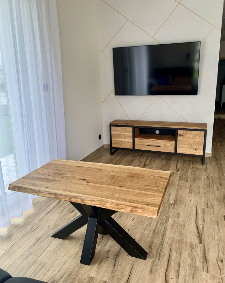 Przedstawiamy Państwu szafkę RTV wykonaną z litego drewna dębowego w stylu rustykalnym. Stalowy stelaż, który jednocześnie wyglada lekko i nowocześnie, zagwarantuje niebywałą trwałość. Szafka RTV będzie mogła cieszyć Nasze oczy przez długie lata, nie tracąc przy tym nic ze swojej niepowtarzalnej, prostej i pięknej formy. Po bokach znajdują się dwie szafki otwierane ,,na klik,,. Po środku szuflada.